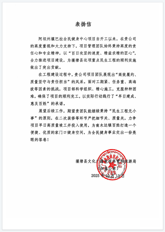 近日,阿坝州壤巴拉全民健身中心项目收到业主单位的表扬信。