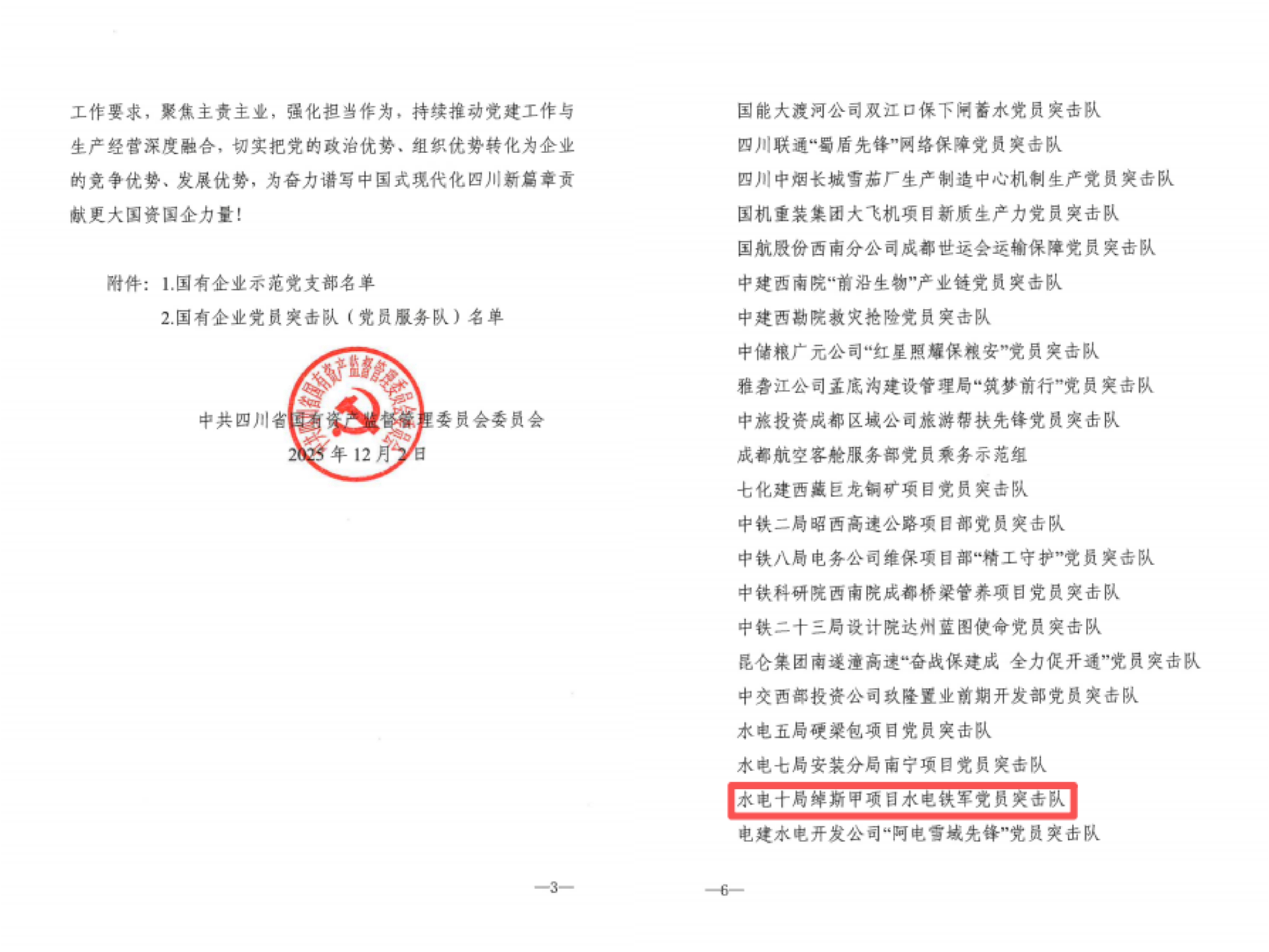 近日,四川省国资委授予绰斯甲项目水电铁军党员突击队“国有企业示范党员突击队”荣誉称号。