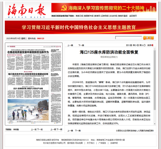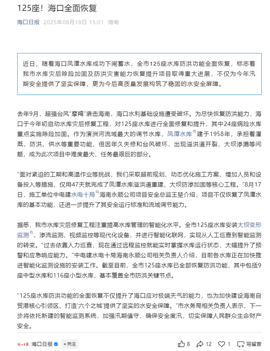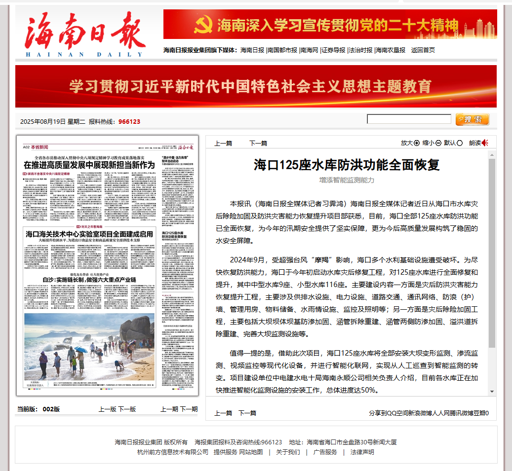 近日,海南日报以“海口125座水库防洪能力全面恢复”为题,报道了海口市水库灾后恢复重建项目。