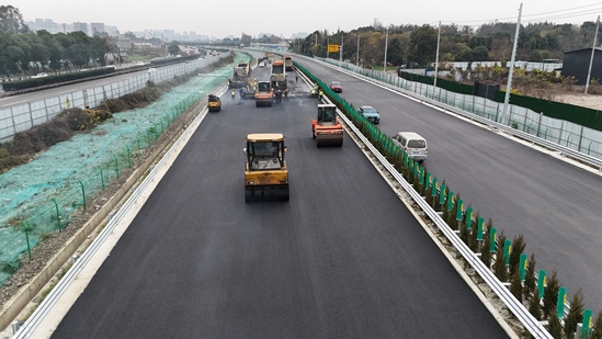 12月21日,成都温江凤凰立交项目施工导行路启动沥青铺筑工序,标志着项目建设重心从路基施工转向路面成型新阶段。