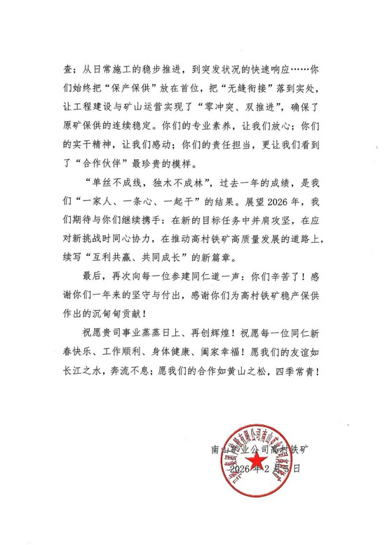 信中指出,面对作业场地狭窄、保产任务重大的多重压力,项目团队坚守一线、精准调度,实现工程建设与矿山运营“零冲突、双推进”,以过硬专业能力与强烈责任担当,为完成全年生产经营目标筑牢基础。