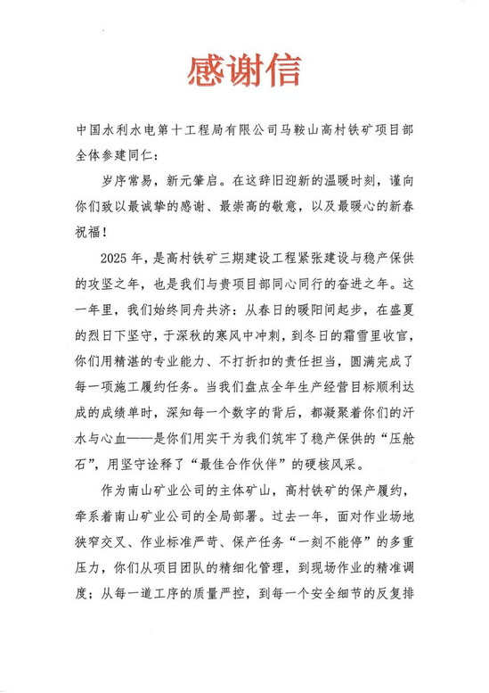 近日,公司承建的马鞍山高村铁矿项目获马钢集团南山矿业公司高村铁矿项目感谢信。