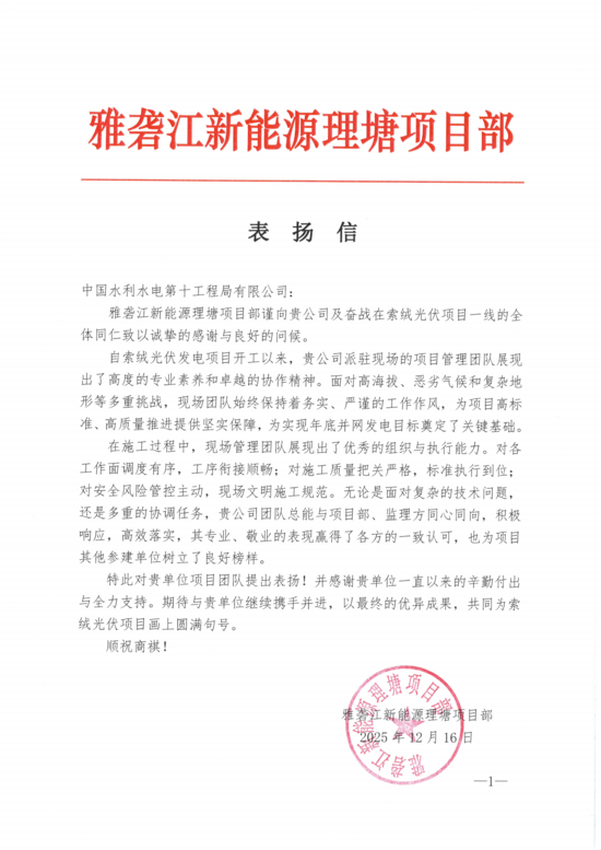 近日,公司收到业主雅砻江新能源黎塘项目部表扬信,对公司及奋战在项目一线的全体建设之致以诚挚的感谢和问候。