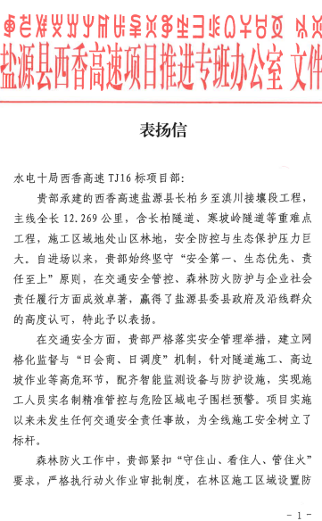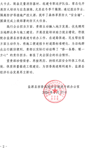 1月28日,公司获盐源县西香高速建设工作专班表扬信。