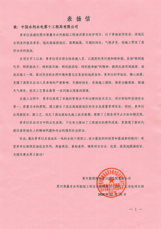 12月31日,黑河黄藏寺水利枢纽工程泄洪雾化防护项目收到黄河勘测规划设计研究院有限公司黑河黄藏寺水利枢纽工程设计采购施工(EPC)总承包项目部发来的表扬信,对项目建设团队攻坚克难、高效履约给予高度认可并通报表扬。