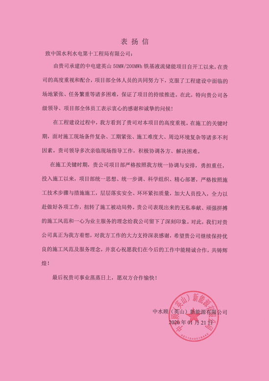近日,公司获中水顾(英山)新能源有限公司发来的表扬信。