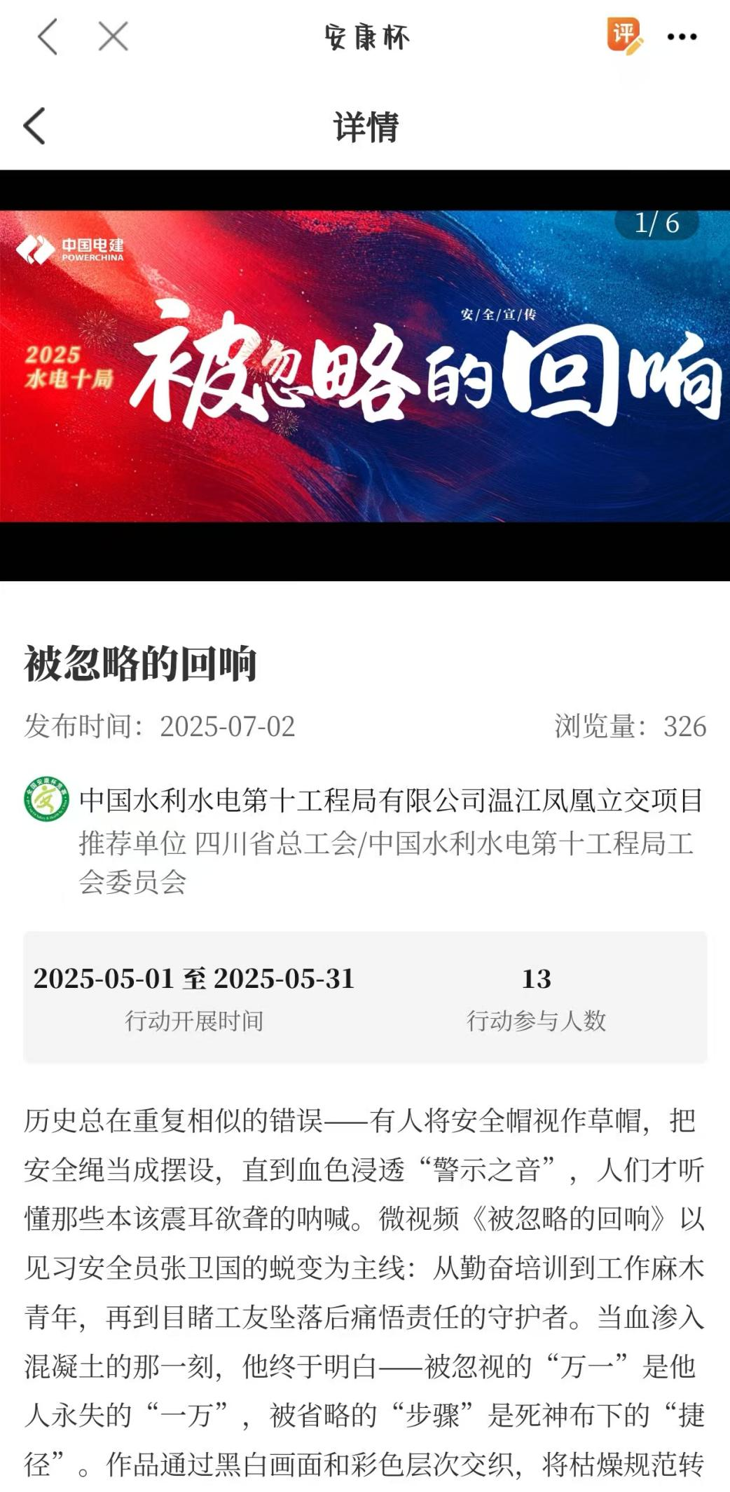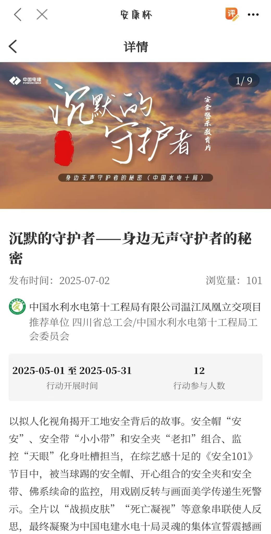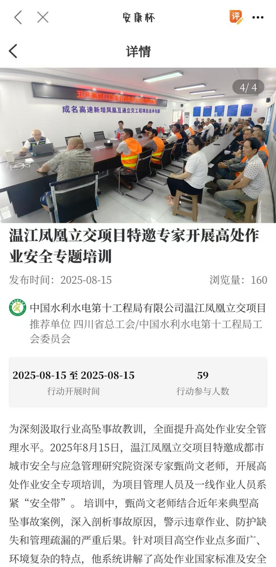 项目积极参加中华全国总工会、应急管理部、国家卫生健康委联合开展的2025-2026年度全国“安康杯”竞赛活动,围绕职工安全健康普法科普、应急演练、班组安全建设等十项行动开展。活动采取参赛单位上传新闻稿件的方式进行积分,竞赛新闻稿由中华全国总工会择优发布,紧扣我国当前安全生产和职业病防治重点工作,广泛动员职工群众特别是基层一线职工、农民工参与其中。活动为进一步保障职工安全和健康权益、充分防范遏制生产安全事故和职业病危害发挥重要作用。
