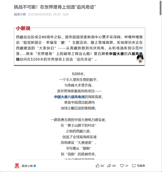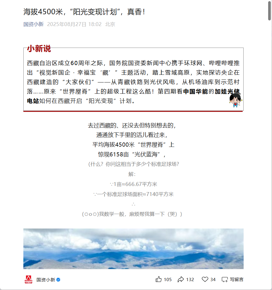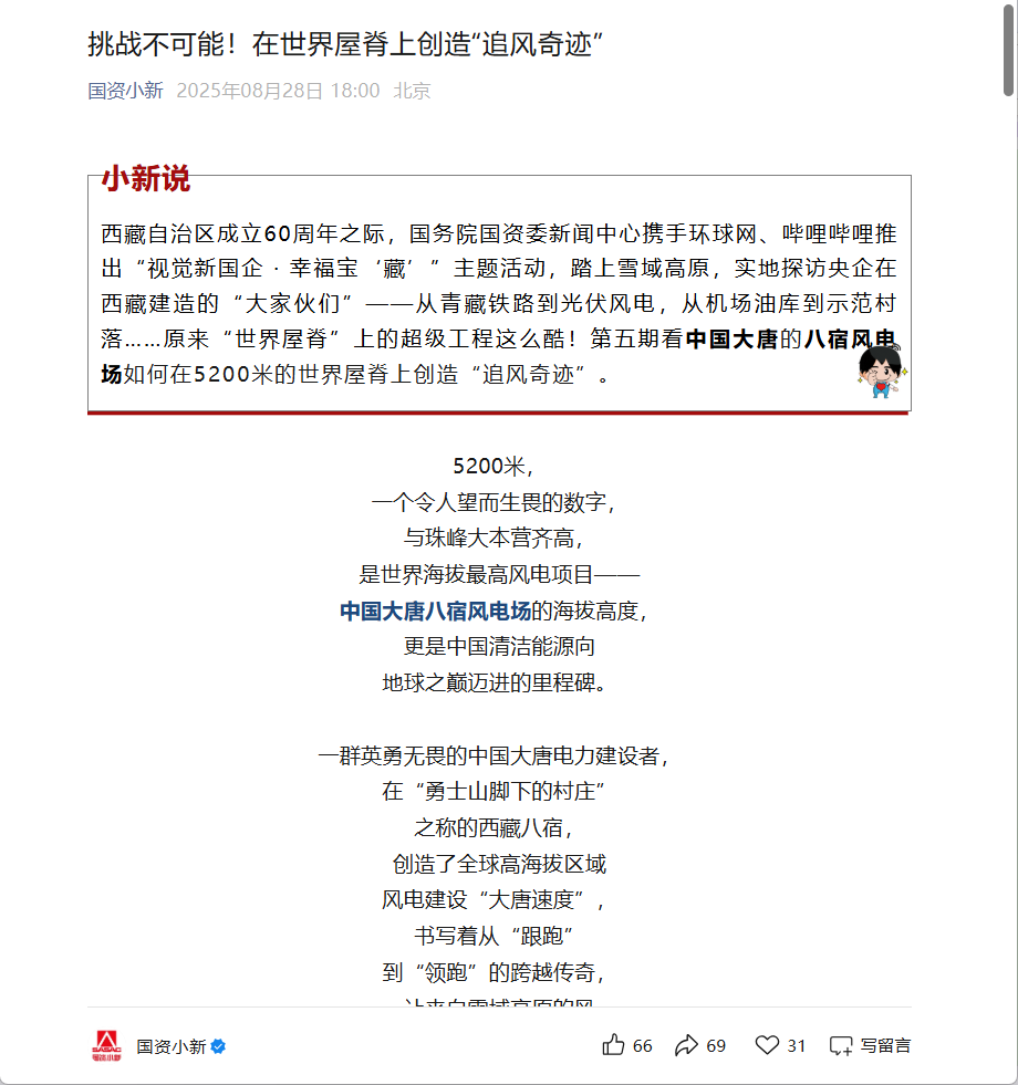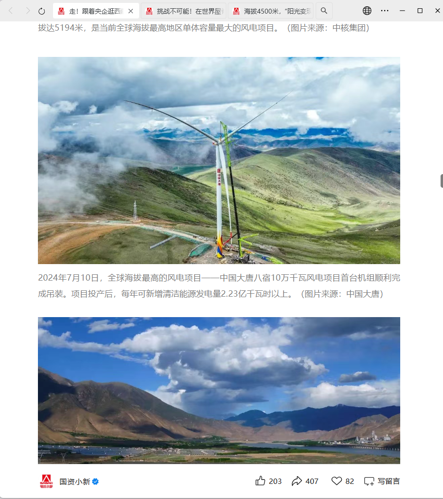 日前,在西藏自治区成立60周年之际,国资小新发表专题推文《海拔4500米,“阳光变现计划”,真香!》《挑战不可能!在世界屋脊上创造“追风奇迹”》《走!跟着央企逛西藏!》,聚焦公司承建的加娃光储电站与八宿风电场项目。