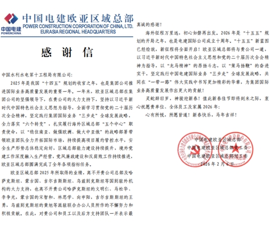 日前,公司获电建集团欧亚区域总部发来感谢信。
